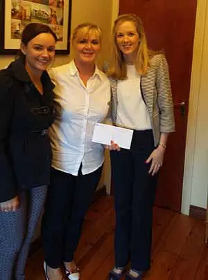 Cheque presentation of €400 from Grant Thornton's representatives Amy Adams and Ruth Costello to Bethany House Manager, Teresa Gilchriest.