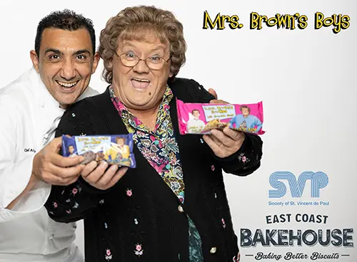 Speaking at the launch Brendan O’Carroll said, “East Coast Bakehouse has done a wonderful job in producing these biscuits. I promise the Chef Aly recipe has made them the tastiest biscuits I have ever tasted and we are delighted to use this launch to raise funds for St Vincent de Paul and to highlight the plight of those who are in need. It is going to be a great week”.